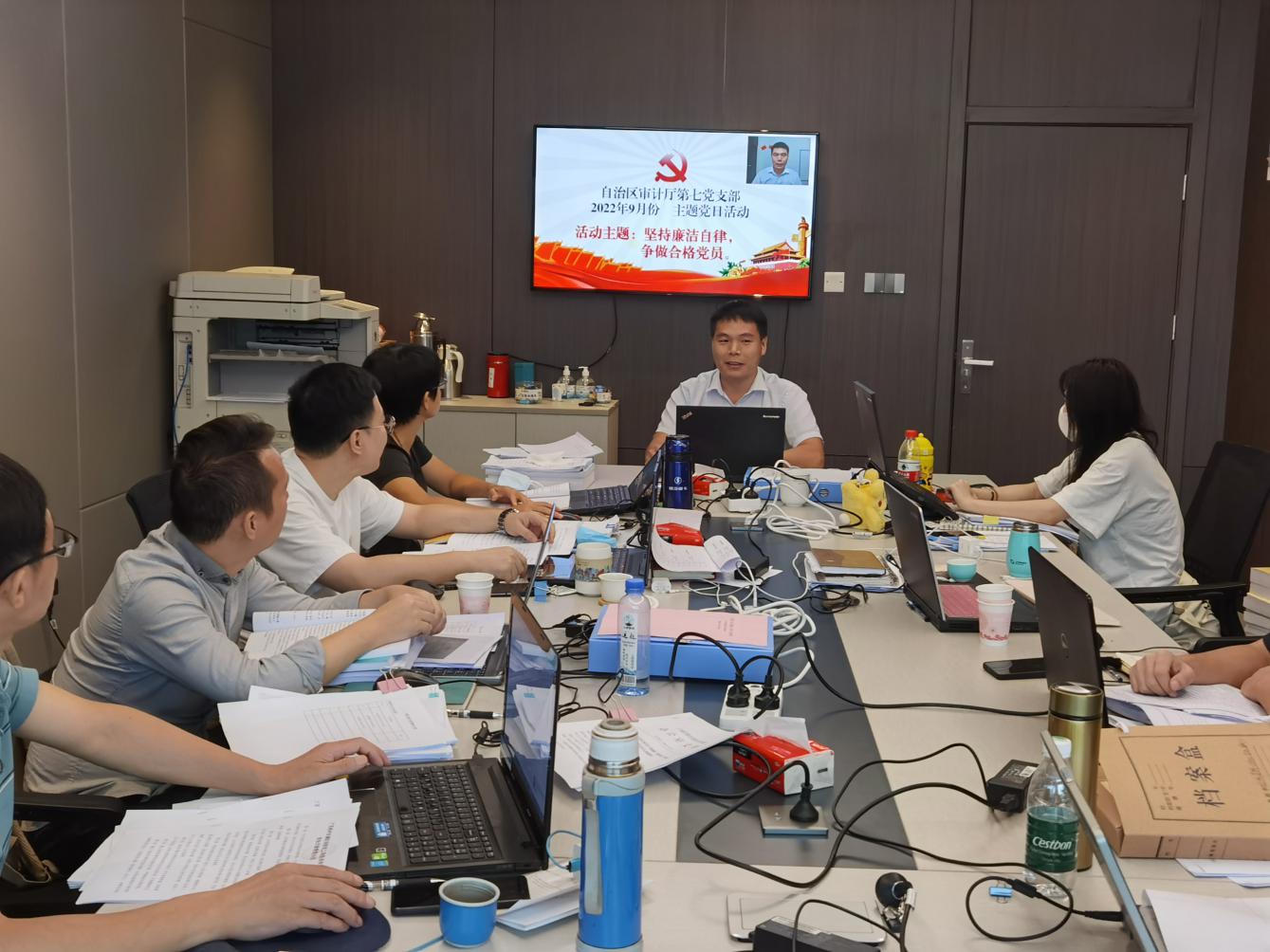 为进一步落实“主题党日”制度,引领支部党员以良好风貌迎接党的二十大胜利召开,结合党员都出差或分布在全区各个审计点上,难以集中到一起开展活动的特殊情况,近日,自治区审计厅机关第七党支部采用线上视频的方式开展“坚持廉洁自律,争做合格党员”主题党日活动。
