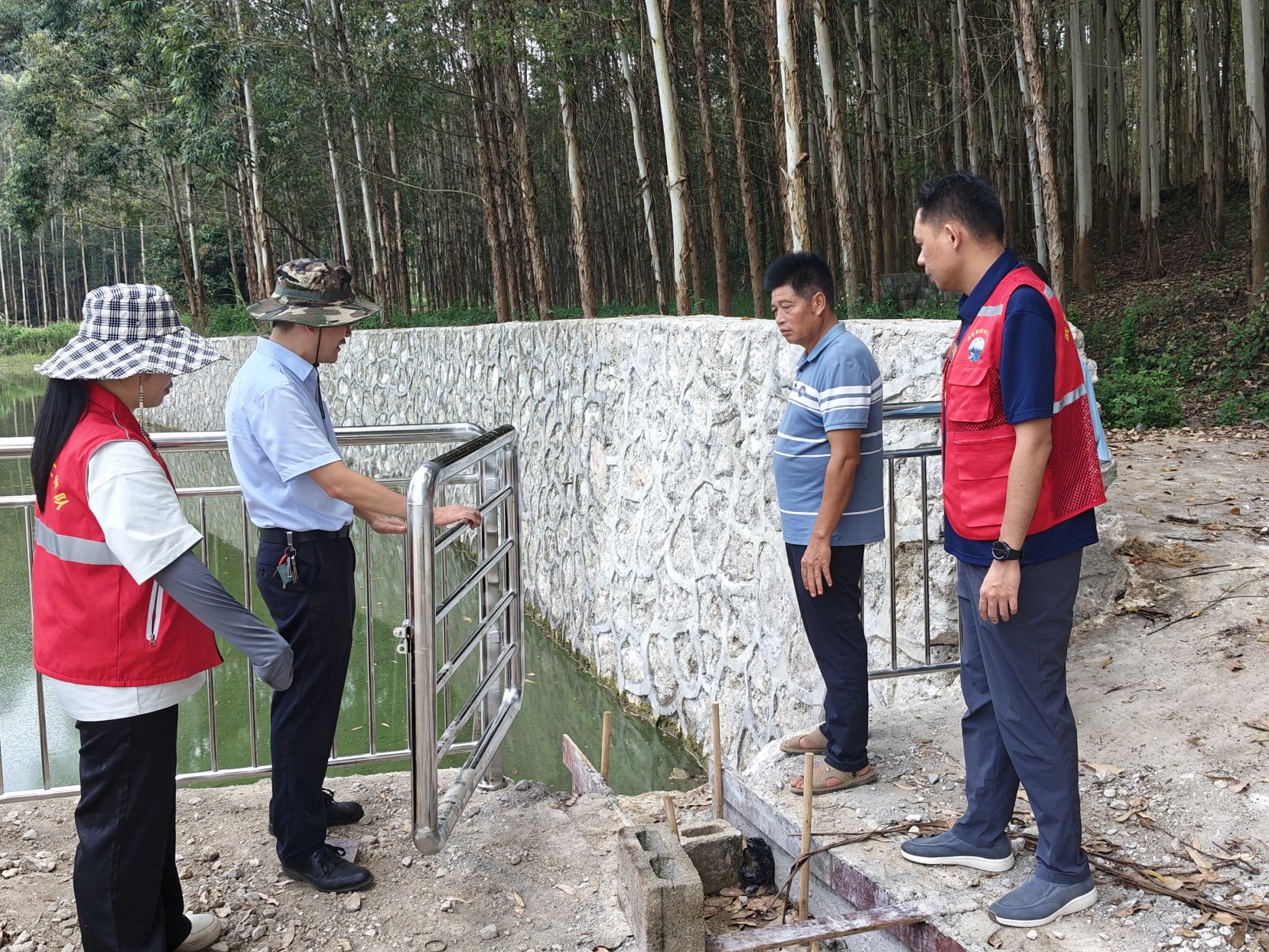 图为自治区审计厅派驻武宣县复旦村工作队在验收新安装的水坝护栏