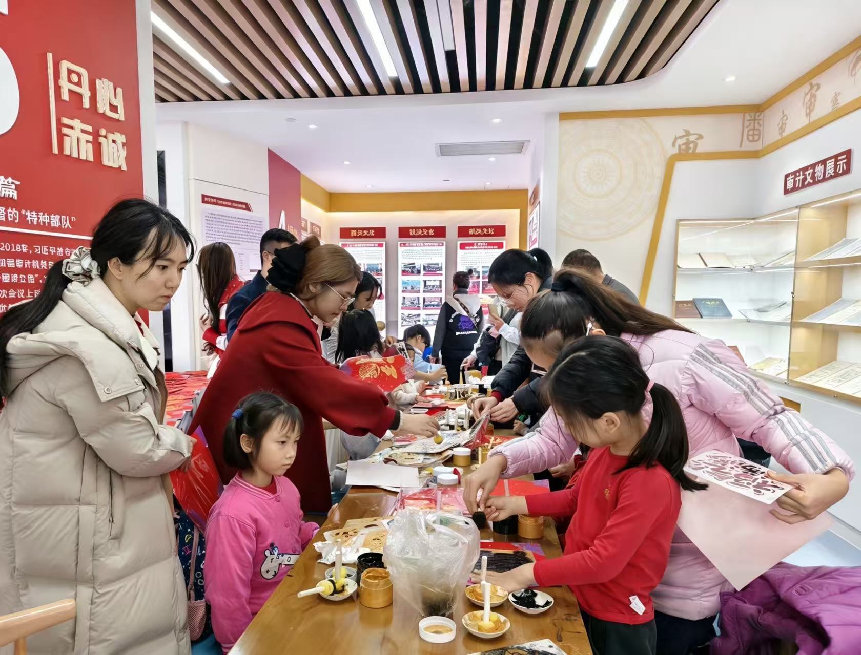 活动现场布置了简洁而富有节日氛围的灯笼装饰,自治区审计厅书法志愿者的春联作品点缀其间,处处洋溢着浓浓的年味。活动现场设置的主题项目,既有传统手工艺体验,又有趣味互动游戏。在剪纸工坊区,干部职工与家属围坐一堂,不一会儿,一幅幅寓意吉祥的“福”字、马年的生肖图案跃然纸上;拓印年画区,大家亲手拓印传统年画,感受非遗技艺的匠心传承;灯笼猜谜区,谜面内容涵盖传统文化、审计业务知识等,吸引众多审计干部职工驻足参与;四季纳福投壶、蹴鞠福球入门等传统游戏项目则成为热门活动,参与者屏息凝神、全神贯注投掷,欢声笑语此起彼伏;亲子板鞋赛现场,家长与孩子们并肩奔跑,在默契配合中传递着亲情与欢乐;“赶马入笼”趣味挑战则考验着团队协作能力,众人齐心协力将“福马”送入“福笼”,赢得了阵阵掌声。