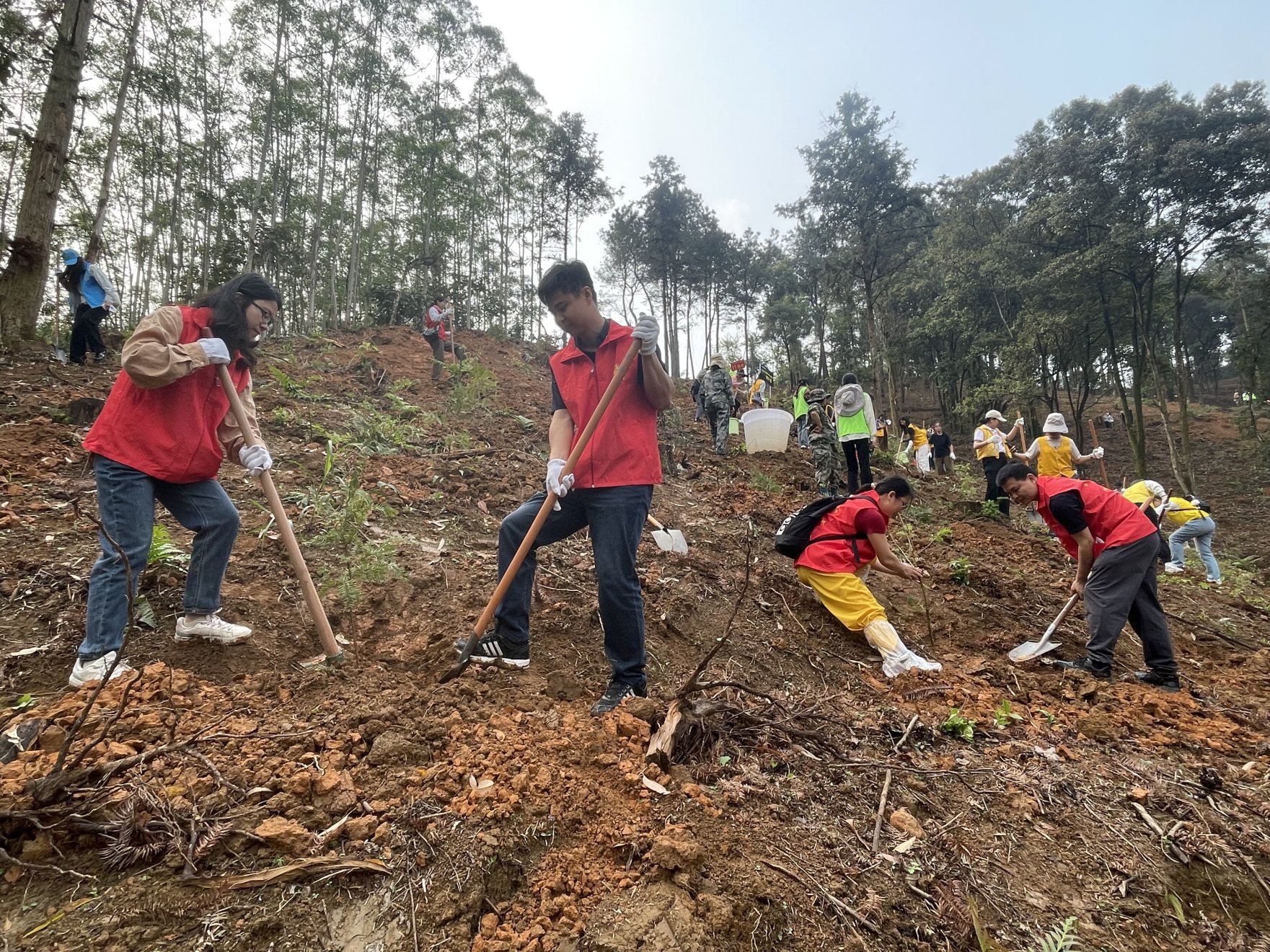 活动现场,自治区审计厅青年志愿者们与来自区直、中直驻桂单位及区管高校等单位约500名青年代表来到植树地点的各个山头岭上,一同投身义务植树劳动。在林业技术人员的专业指导下,大家分工明确、默契配合,挥锹铲土、扶苗填坑、提水浇灌,合力种下一株株江南油杉,齐心协力植绿护绿。植树现场热火朝天,新栽的树苗错落有致、迎风挺立,为“青年林”再添盎然新绿。