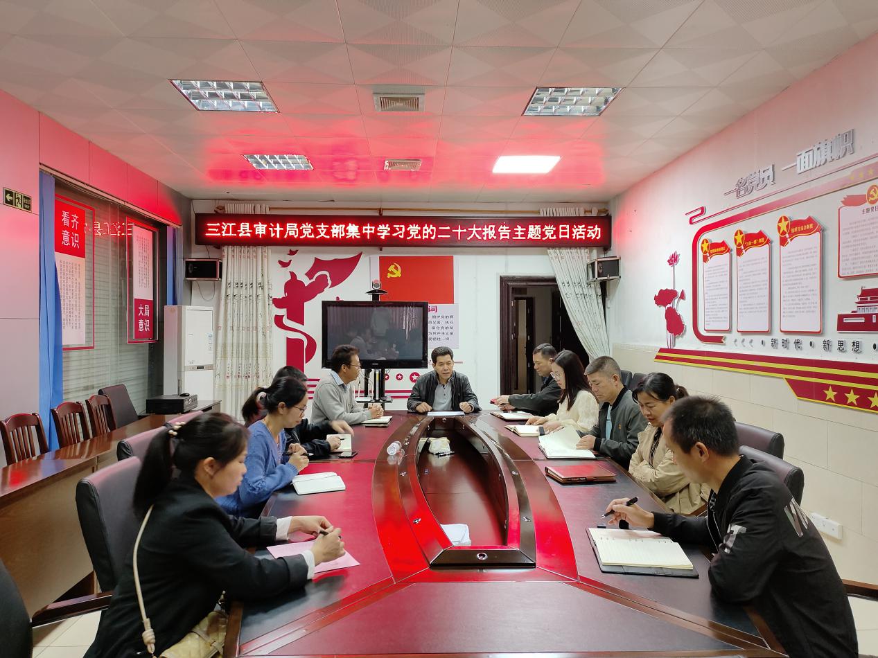 图为三江县审计局党支部组织集中学习党的二十大报告