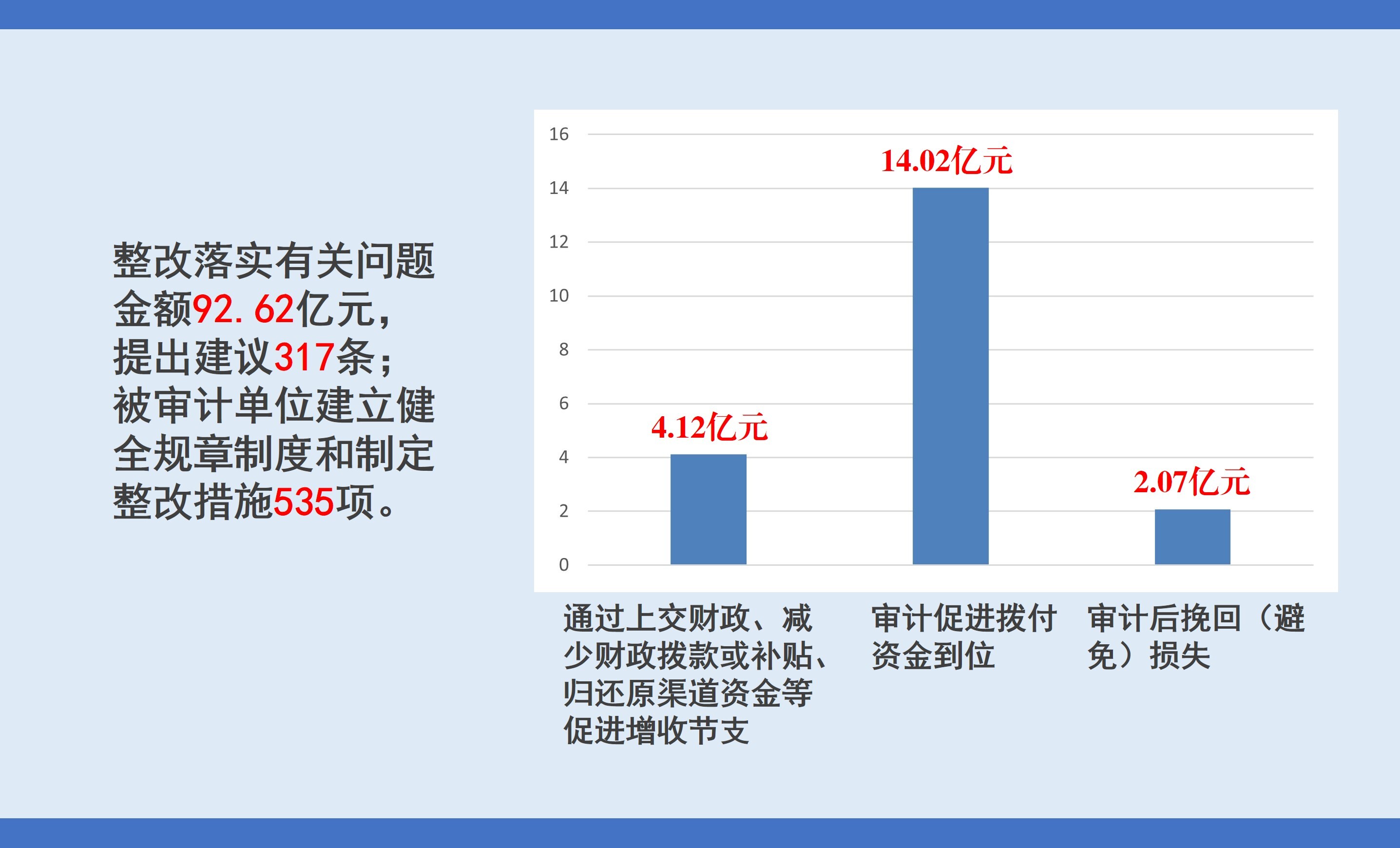2025年1至8月,审计厅累计完成审计项目72个,查出问题金额878.13亿元,其中:违规金额131.80亿元、损失浪费金额18.0亿元。审计发现并移送违法违纪问题线索17件,涉及27人。审计促进整改落实有关问题金额92.62亿元,其中通过上交财政、减少财政拨款或补贴、归还原渠道资金等促进增收节支4.12亿元;审计促进拨付资金到位14.02亿元;审计后挽回(避免)损失2.07亿元。审计提出建议317条;被审计单位建立健全规章制度和制定整改措施535项。